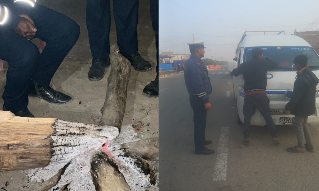 जाडो र हुस्सु बढेपछि धनुषामा आगो ताप्ने र गाडीको सिसा पुछ्ने ट्राफिक प्रहरीको अभियान