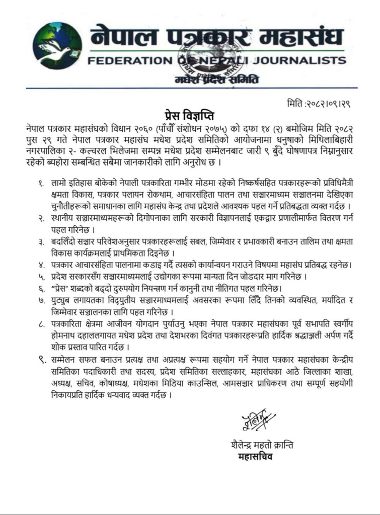 नेपाल पत्रकार महासंघ मधेश प्रदेशका महासचिव शैलेन्द्र महतो क्रान्तिले प्रेस विज्ञप्ति जारी गर्दै सार्वजनिक गरेको घोषणा पत्रमा पत्रकार आचारसंहिता पालनामा कडाइ गर्ने, प्रदेश सरकारसँग सञ्चारमाध्यमलाई उद्योगका रूपमा मान्यता दिन जोडदार माग गर्ने तथा ‘प्रेस’ शब्दको बढ्दो दुरुपयोग नियन्त्रणका लागि कानुनी तथा नीतिगत पहल गर्ने उल्लेख छ ।