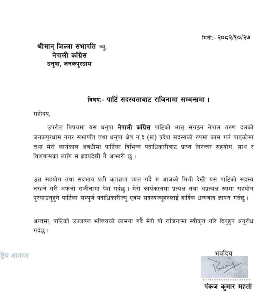 ‘यस धनुषा नेपाली काँग्रेस पार्टिको भात्तृ संगठन नेपाल तरुण दलको जनकपुरधाम नगर सभापति तथा धनुषा क्षेत्र नं। ३ (ख) प्रदेश सदस्यको रुपमा काम गर्न पाएकोमा तथा मेरो कार्यकाल अवधीमा पार्टिका विभिन्न पदाधिकारीबाट प्राप्त निरन्तर सहयोग, साथ र विशवासका लागि म हृदयदेखी नै आभारी छु’ उनले राजिनामा पत्रमा उल्लेख गरेका छन् ।